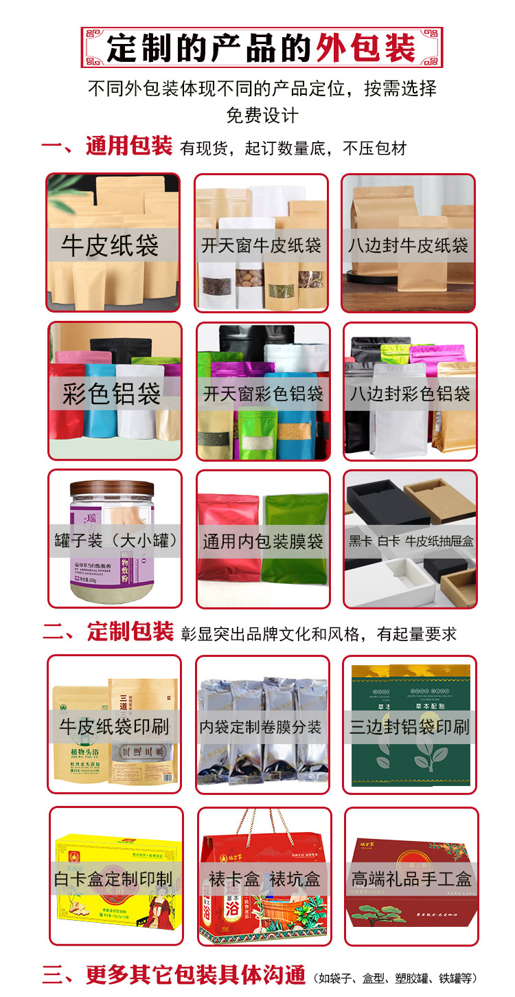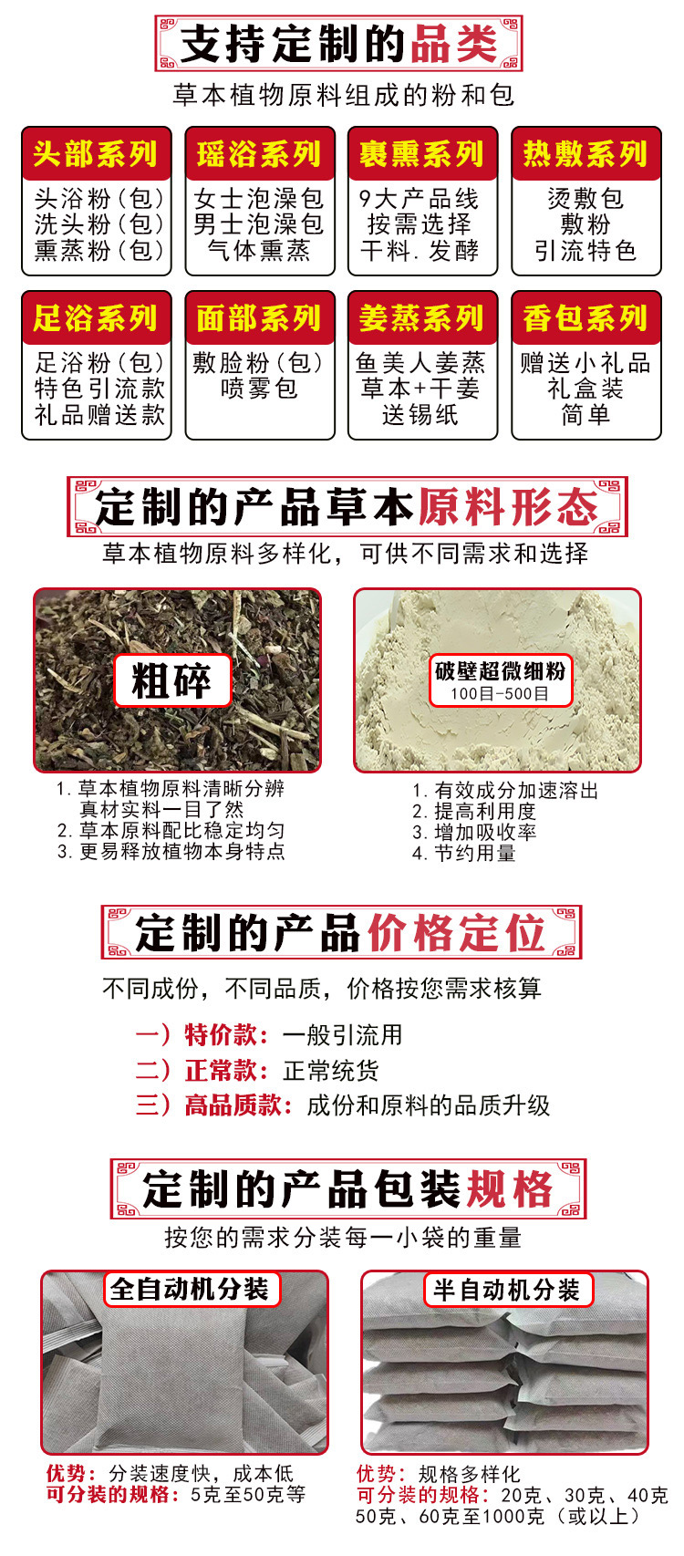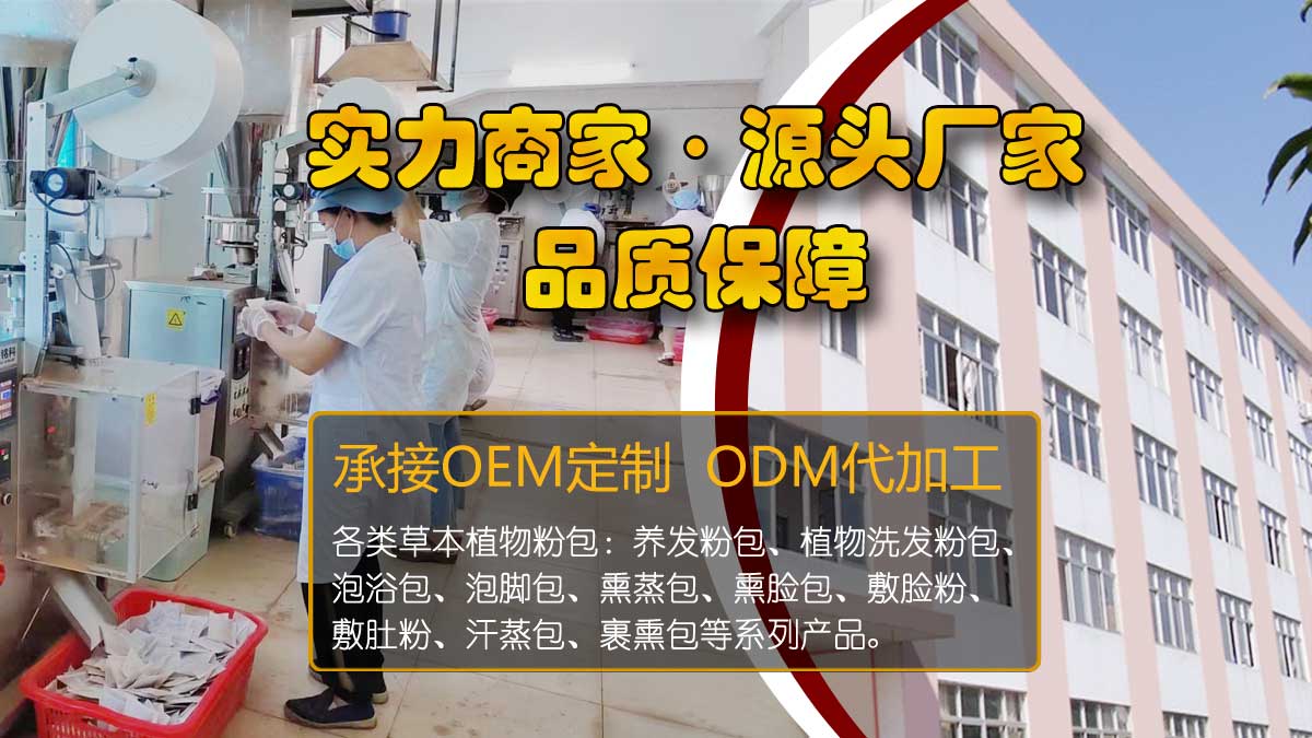 工厂主要生产草本植物外用品,目前包含9大系列:草本头浴熏蒸、养发粉、九五裹养汗法、