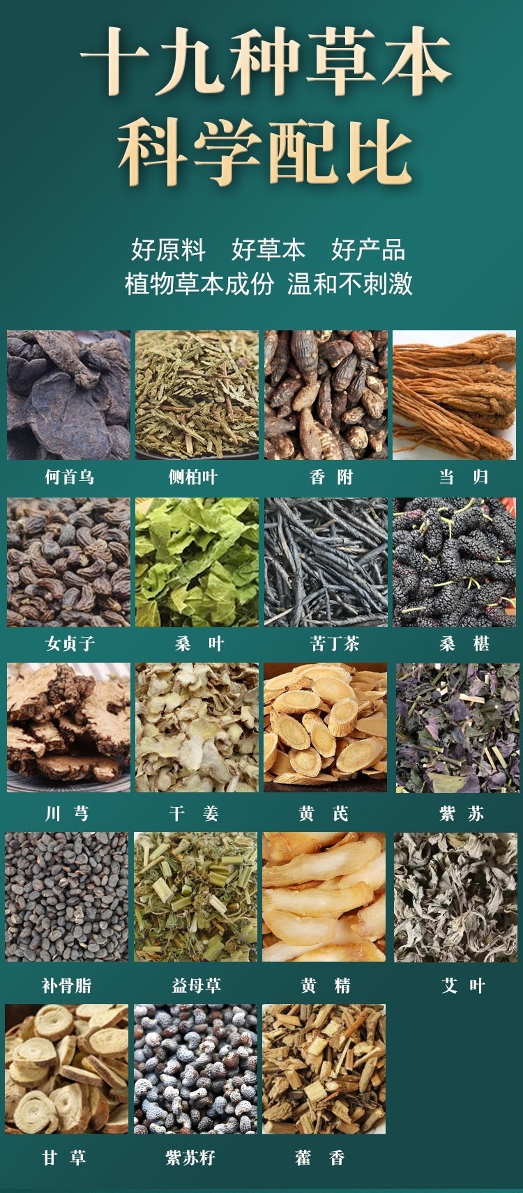 产品成份:制何首乌、侧柏叶、香附、当归、女贞子、桑叶、苦丁茶、桑椹、川芎、干姜、黄芪、紫苏、补骨脂、益母草、黄精、艾叶、甘草、紫苏籽、藿香